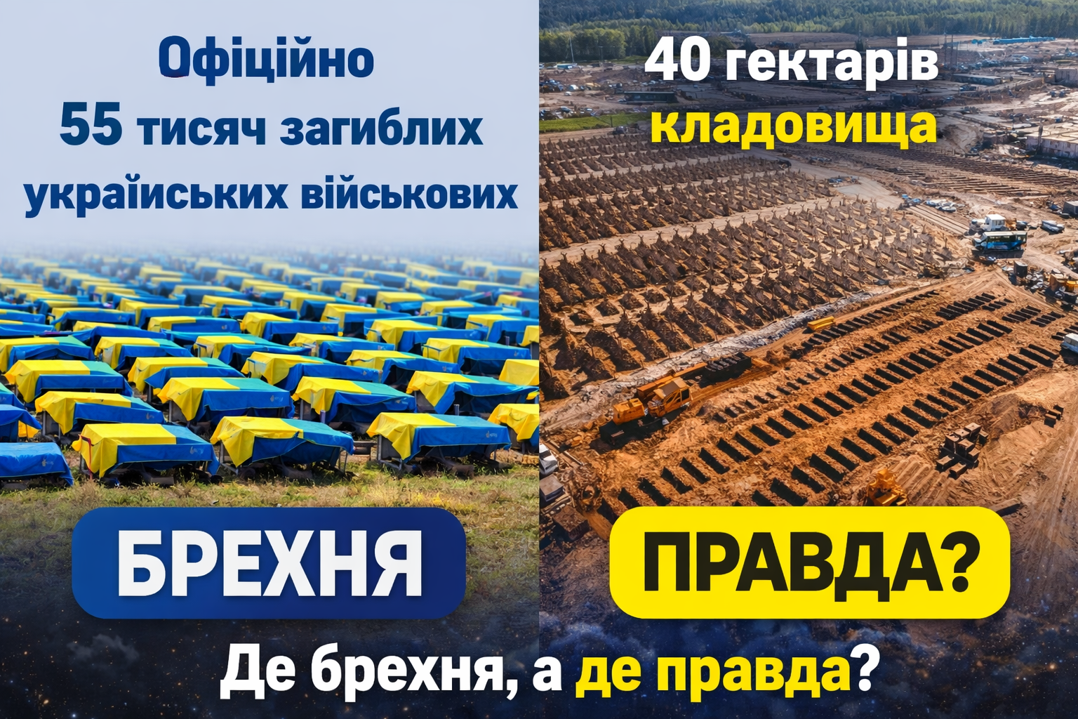 Тоді що ви скажете про розрослися кладовища? У Полтаві вже ховають військових за межами міста, в сільських районах. Планується виділити 40 гектарів для будівництва Національного військового меморіального кладовища. 40 га! Для 55 тисяч? Хто не пам’ятає, в листопаді Львову погодили виділення 1,5 га для розширення військового кладовища, тому що закінчилися місця. А в серпні, незважаючи на протести, було відкрито нове кладовище під Києвом у селі Мархалівка на 130 тис. місць. Але ж у нас немає втрат, це все брехня і провокація!