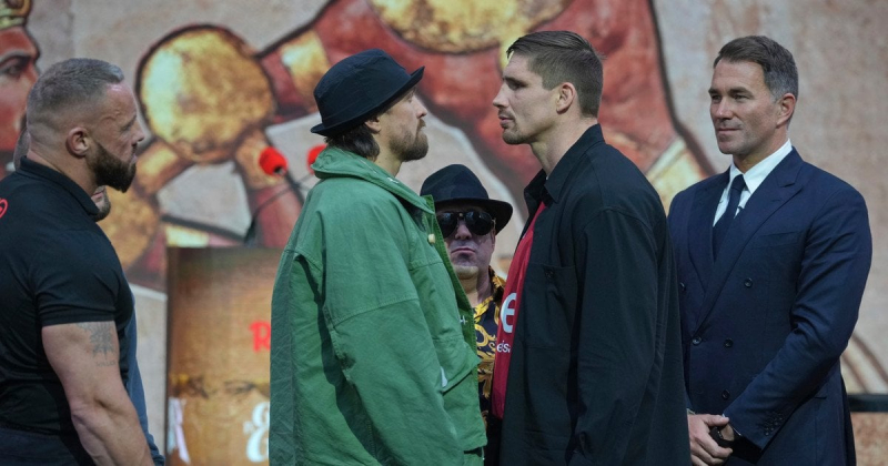 Чемпіон світу з боксу в надважкій вазі за версіями WBA, WBC та IBF Олександр Усик та нідерландський кікбоксер Ріко Верховен провели першу битву поглядів перед чемпіонським поєдинком.